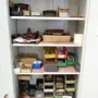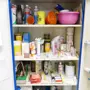 2 portes, env. 100x200 cm, rempli de : serre-joints, extracteurs, abrasifs, tuyaux pneumatiques, etc., dérouleur de papier, fabr. Kimberly Clark, avec support pour sacs poubelle